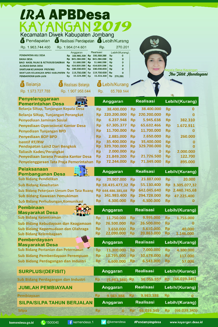 Sebagai wujud komitmen kami pada transparansi publik dan dalam rangka implementasi UU No.6/2014 tentang Desa, kami mempublikasikan informasi Laporan Realisasi APBDesa Kayangan Tahun 2019.
